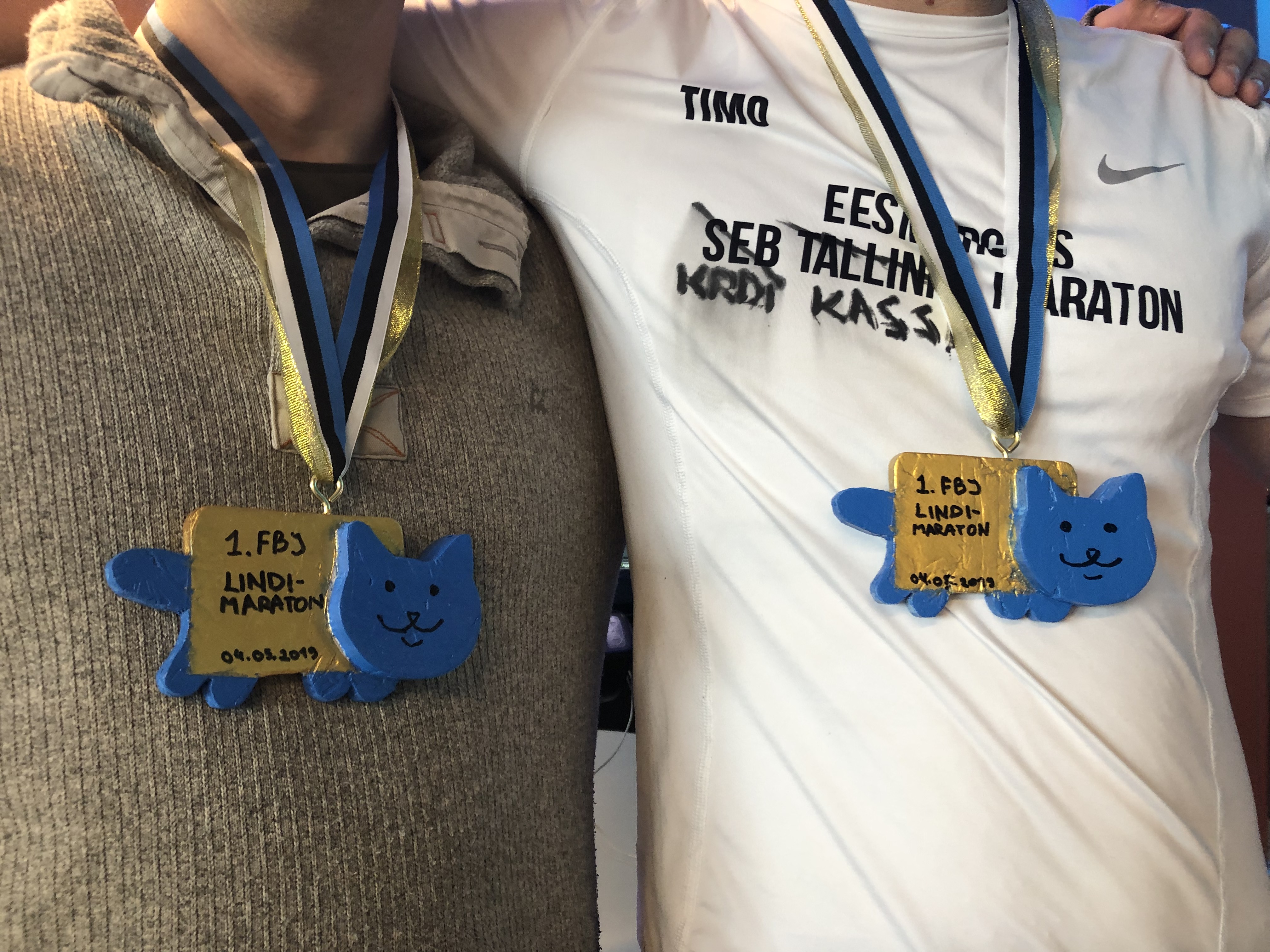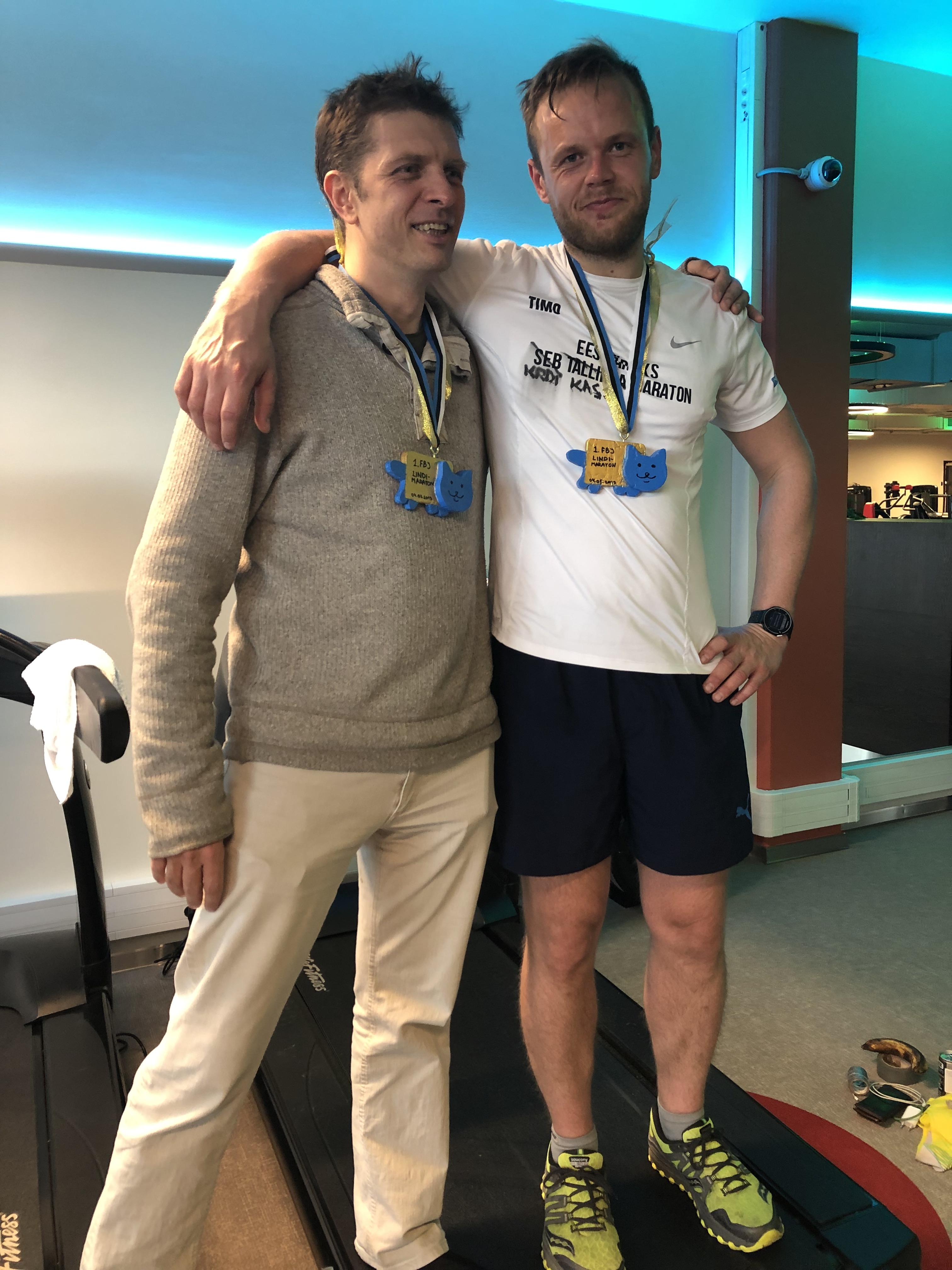 Meie esimesed meistrid lindil joostud maratonis kõnnivad veel pisut vaevaliselt, kuid siiski saab nüüd võib kindlalt öelda “TEHTUD”.  Mõlemad jooksid distantsi läbi (eest ära ei saanud üksteisel joosta), ilma üle siseruumides vinguda ei saanud, ja tehnika ka alt ei vedanud (va fakt, et maratoniprogramm lubab lindil joosta maratoni mitte rohkem kui 4 tunniga).  Võtan endale täieõigusliku õiguse eriti lähedase kõrvaltseisja pilguga väike tagasivaade teha. Päev enne sai klubis lindid veel üle kontrolitud, et ikka õige distantsi peale lasevad panna, piisavalt valge sein vastu vahiks ja meestele sõnad peale loetud, et kassimuusika fail ikka korralikult alla allditud oleks, kõrvaklapid ja telefon laetud saaks ning vaimud valmis oleks.  Ehk kõik oli olemas.